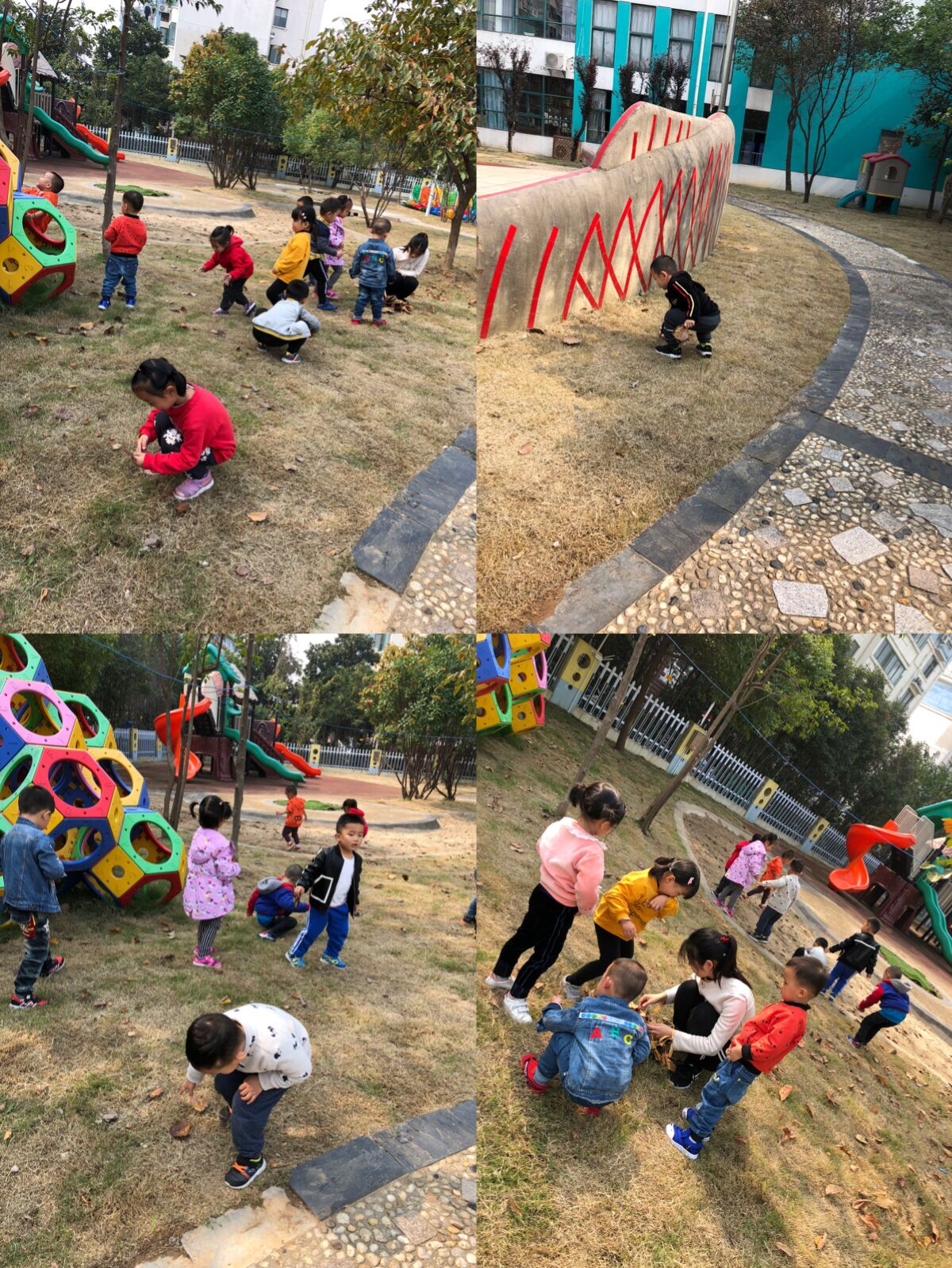 今天我们利用中午餐后散步时间带领孩子走出班门,走进园内,当走出去时孩子就说“地上好多树叶啊”我说“为什么地上这么多树叶呢”“因为他们累了”孩子们的童言稚语却引发了我的思考,利用此次机会让孩子们初步了解秋天这个季节,因为秋天到了,秋风吹,落叶飘,小树叶像不像在快乐舞蹈呢!那我们把地上的树叶捡起来带回班级我们跟树叶宝宝一起游戏好吗?孩子们开心的捡起树叶。