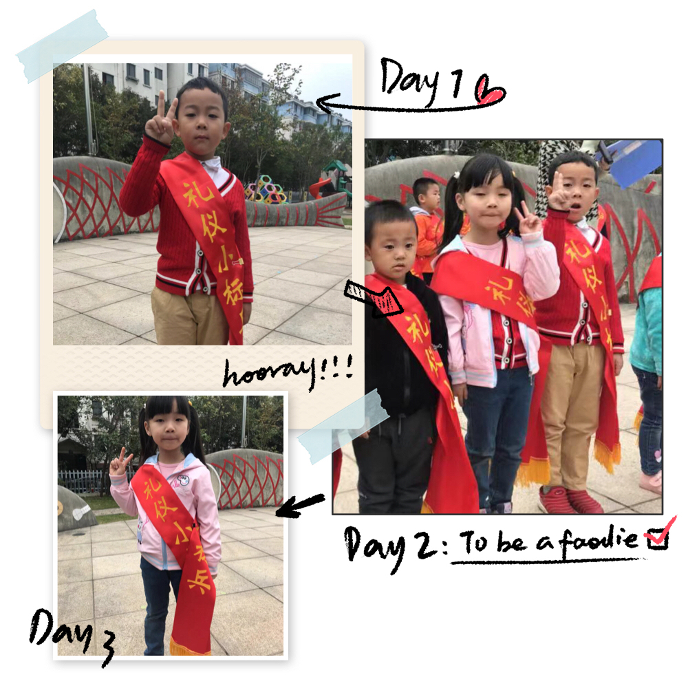 本周的礼仪小标兵是陶沐阳和杨凯喻小朋友。两位小朋友的进步很大哦,老师为他们带上了光荣的行为小标兵的绶带。心里都是美滋滋的。其他的小朋友也要继续努力哦,下个礼仪小标兵就是你!