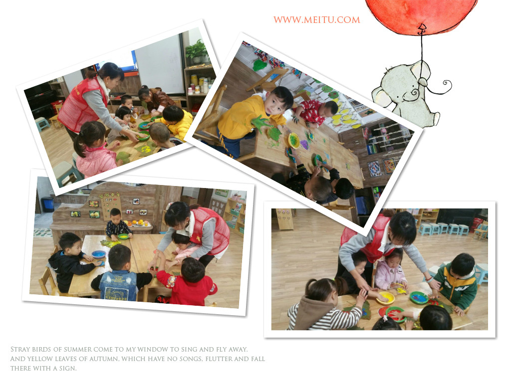 秋天呀秋天呀,树叶到处飞呀飞……这是孩子们最近总唱一首歌。大树为了更好的过冬,树叶宝宝都从树上落了下来,我们结合季节开展了寻找落叶的活动,孩子们收集了很多梧桐树叶,我们结合主题,带领孩子们进行了梧桐树叶印画,孩子们用自己的小手蘸满颜料然后印在梧桐树叶子上,不同颜色的颜料晕染开后会出现各种颜色,操作中孩子们发现这一现象非常的兴奋,并且都能用自己的语言描述各自的发现,在发展幼儿动手能力的同时,也发展了孩子们的语言表达能力。下面一起来看一看孩子们活动时的场景吧!~