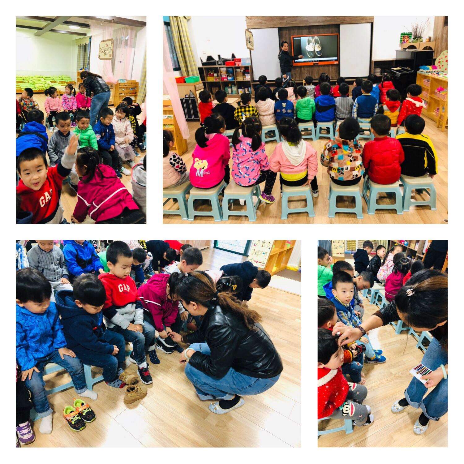 本周生活老师给我们带来的健康活动是正确穿鞋子,老师引导小朋友们,正确的摆放是两只小鞋子像好朋友一样会抱在一起,如果两个好朋友背靠背,生气了,就代表鞋子反了;之后请小朋友现场实践,大部分小朋友可以正确穿鞋子。