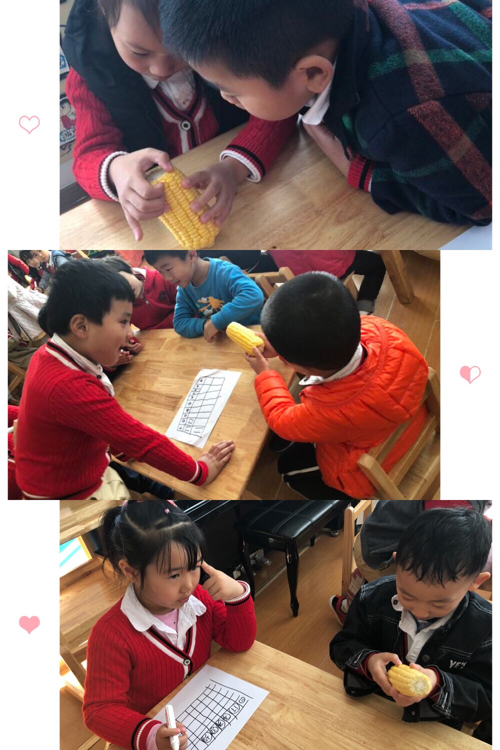 今天的数学活动,孩子们好兴奋,因为我们的道具是——玉米!仅有用玉米来干嘛呢?看一看我们小朋友吧!大家都来研究玉米的排列顺序呢,通过集体数一数,大家知道了,原来玉米的排列都是双数呢!