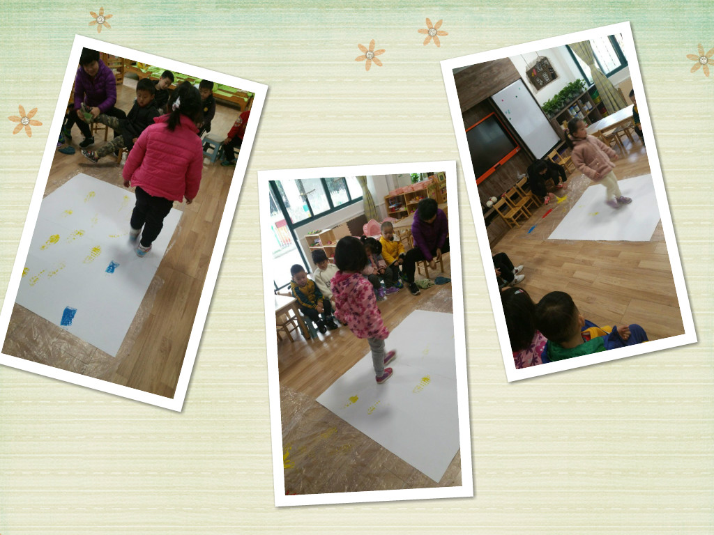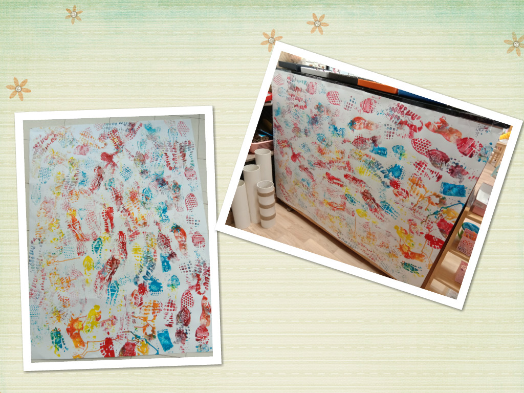 创意无限,看,平时生活中穿的鞋子,也能用于美术创作呢,经过孩子们的小脚和各种颜色的碰撞,展现出了一幅美丽的画,一起来欣赏一下吧!~