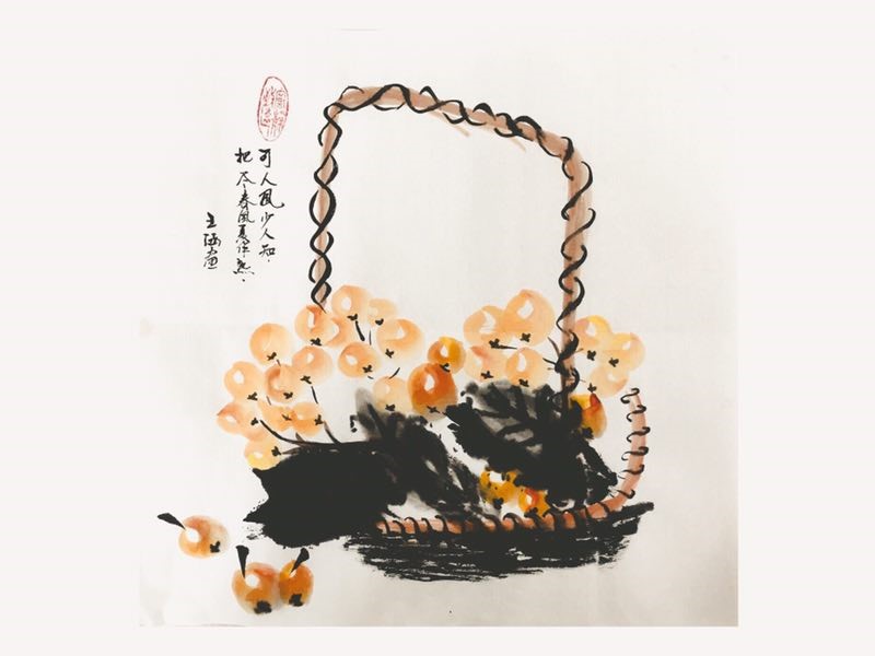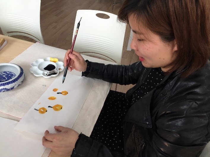 随后在小陶老师的指导下,大家调墨创作了枇杷。在淡雅的墨香中,大家认真地挥墨勾勒枇杷,反复练习,仔细揣摩,个个兴趣盎然,现场气氛浓厚,一片翰墨飘香。
