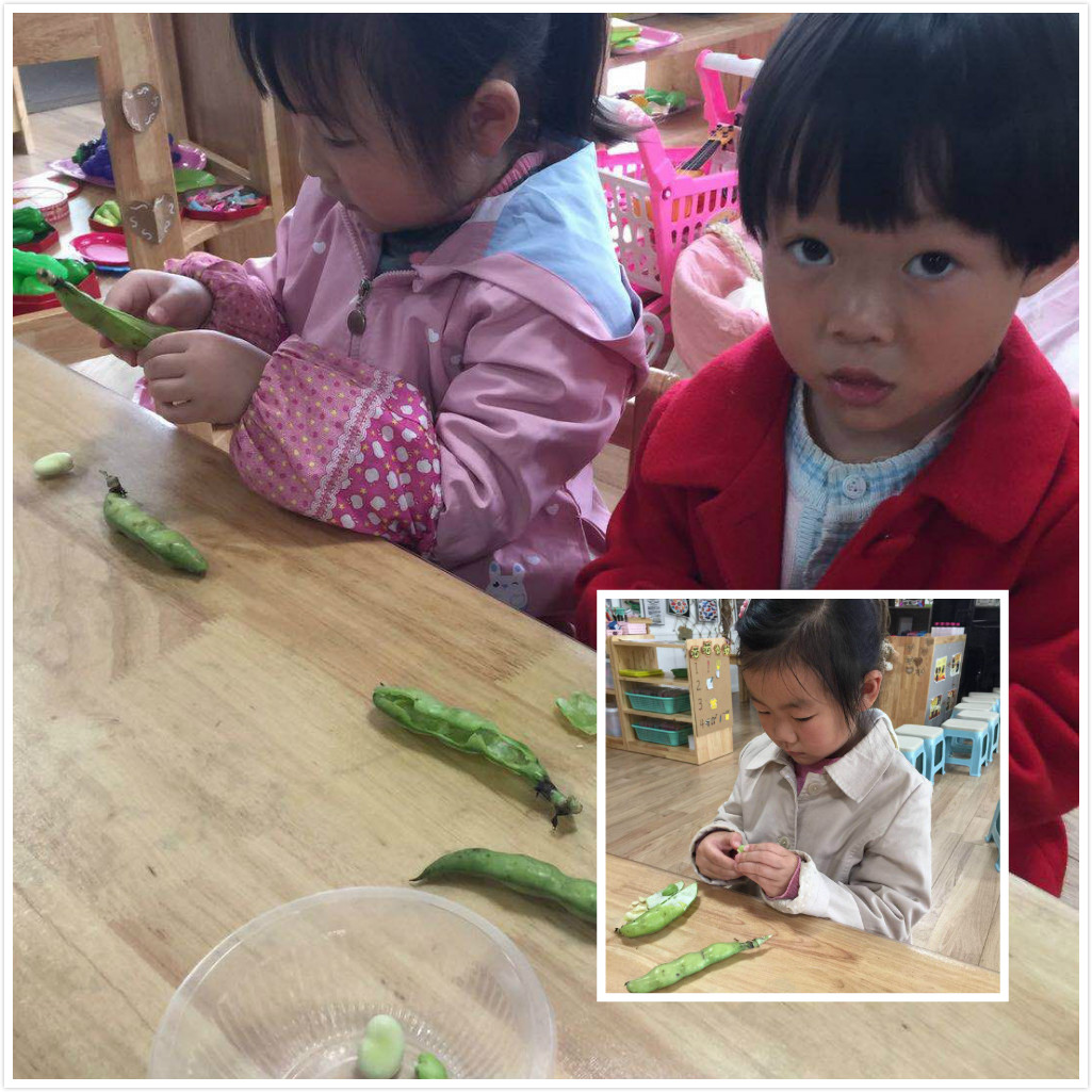 终于拿到了豌豆荚,孩子们立刻动起小手来,认真的剥着蚕豆,孩子们剥的多棒啊!