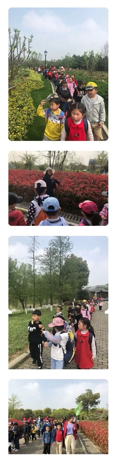 我们出发咯!走出教室的孩子们仿佛飞出笼中的鸟儿,瞧!宝贝们多兴奋呀! 每个班级还有义工阿姨和叔叔全程为我们的踏青活动安全保驾护航,谢谢你们,你们辛苦啦!