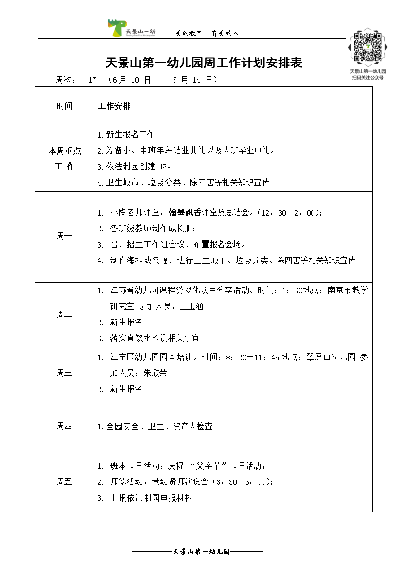 下一篇天景山第一幼儿园第一周工作安排