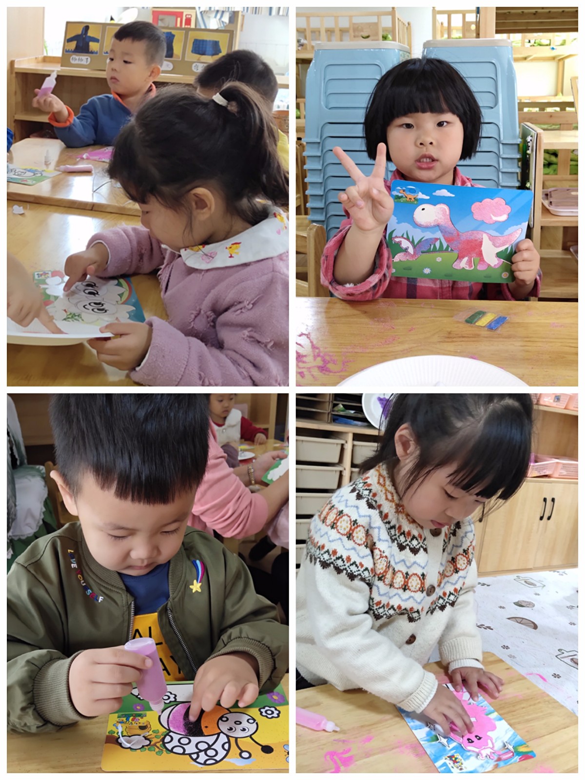 活动开始,家长妈妈出示各种沙画纸,孩子们兴趣盎然地欣赏着,然后家长妈妈请了个别幼儿进行示范操作,孩子们个个迫不及待,跃跃欲试。接下去,就是孩子们自己动手的时间了。首先孩子们选择了自己喜欢的图案,然后,他们选择各种颜色的沙子进行分组作画。孩子们作画期间老师和家长妈妈一起指导孩子们进行协调配色,帮助个别能力弱的孩子完成作品。最后,孩子都坚持完成了自己的作品,成功感和愉悦感油然而生。这次沙画创作活动让孩子们体会到了自由创作的乐趣,也让老师们深刻意识到自由、自主对于孩子创作的重要价值。