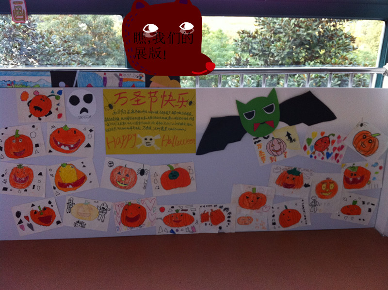 万圣节快到了!我们和老师一起布置环境呢!瞧,我们的展版!