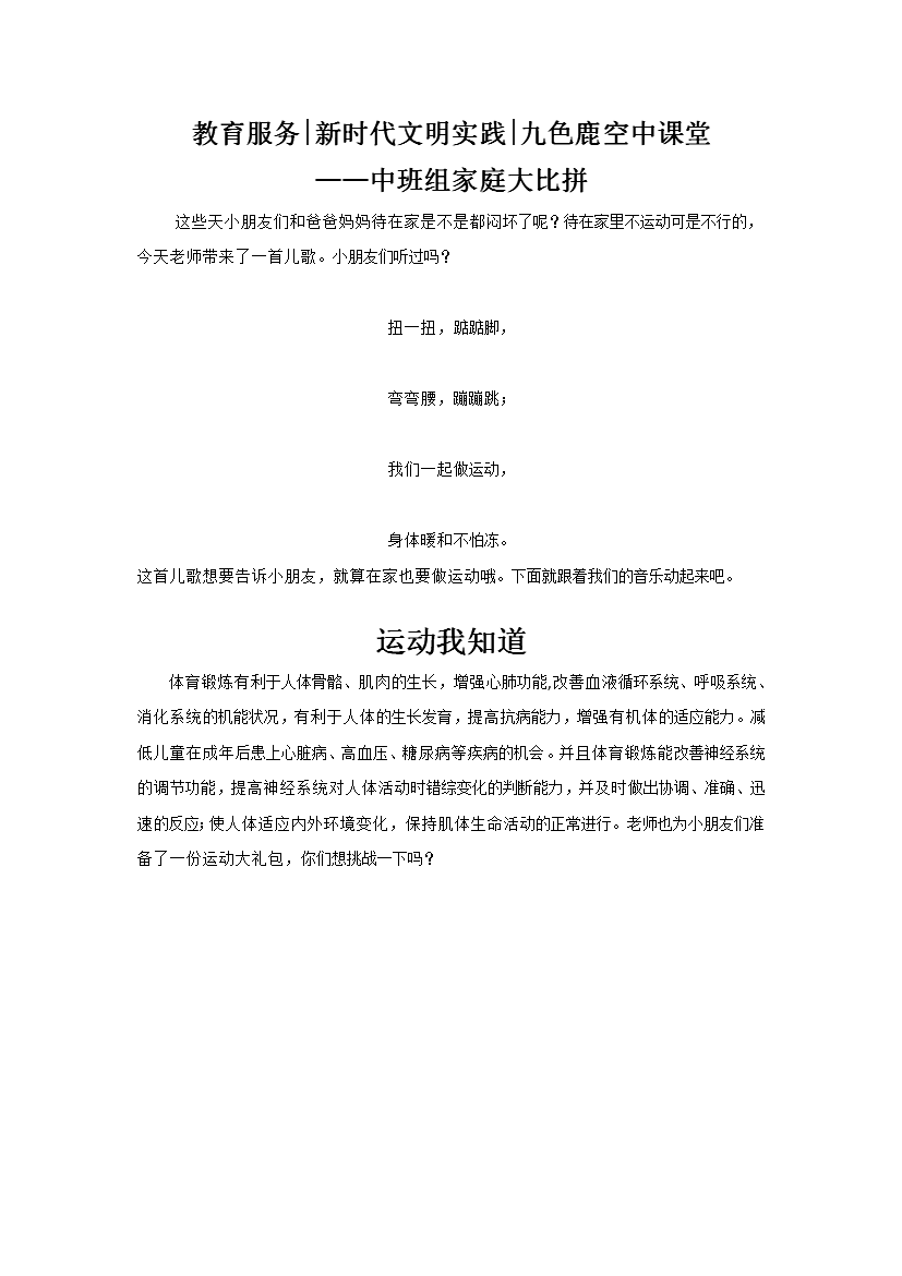 教育服务|新时代文明实践|九色鹿空中课堂——中班组亲子运动《家庭大比拼》
