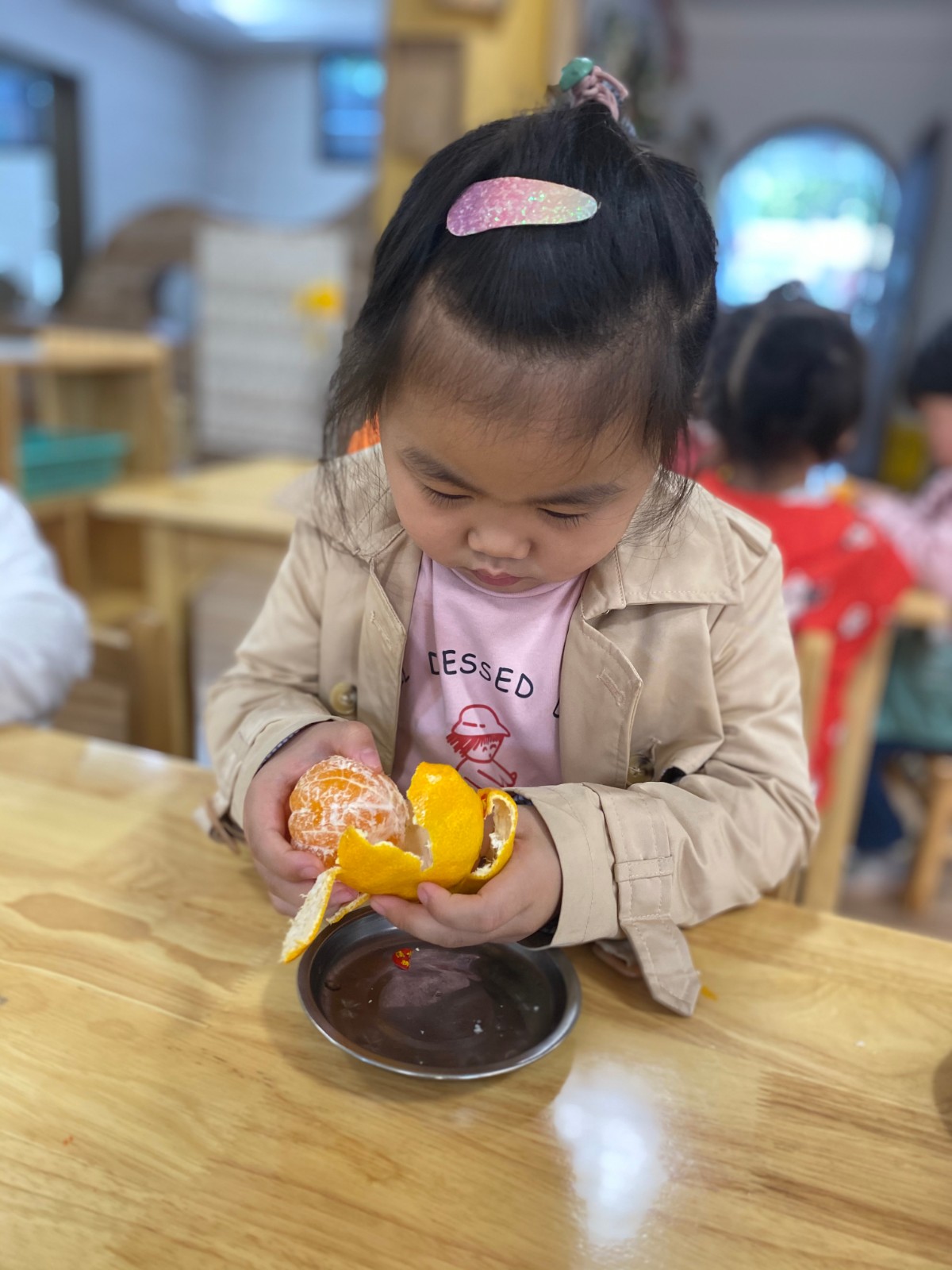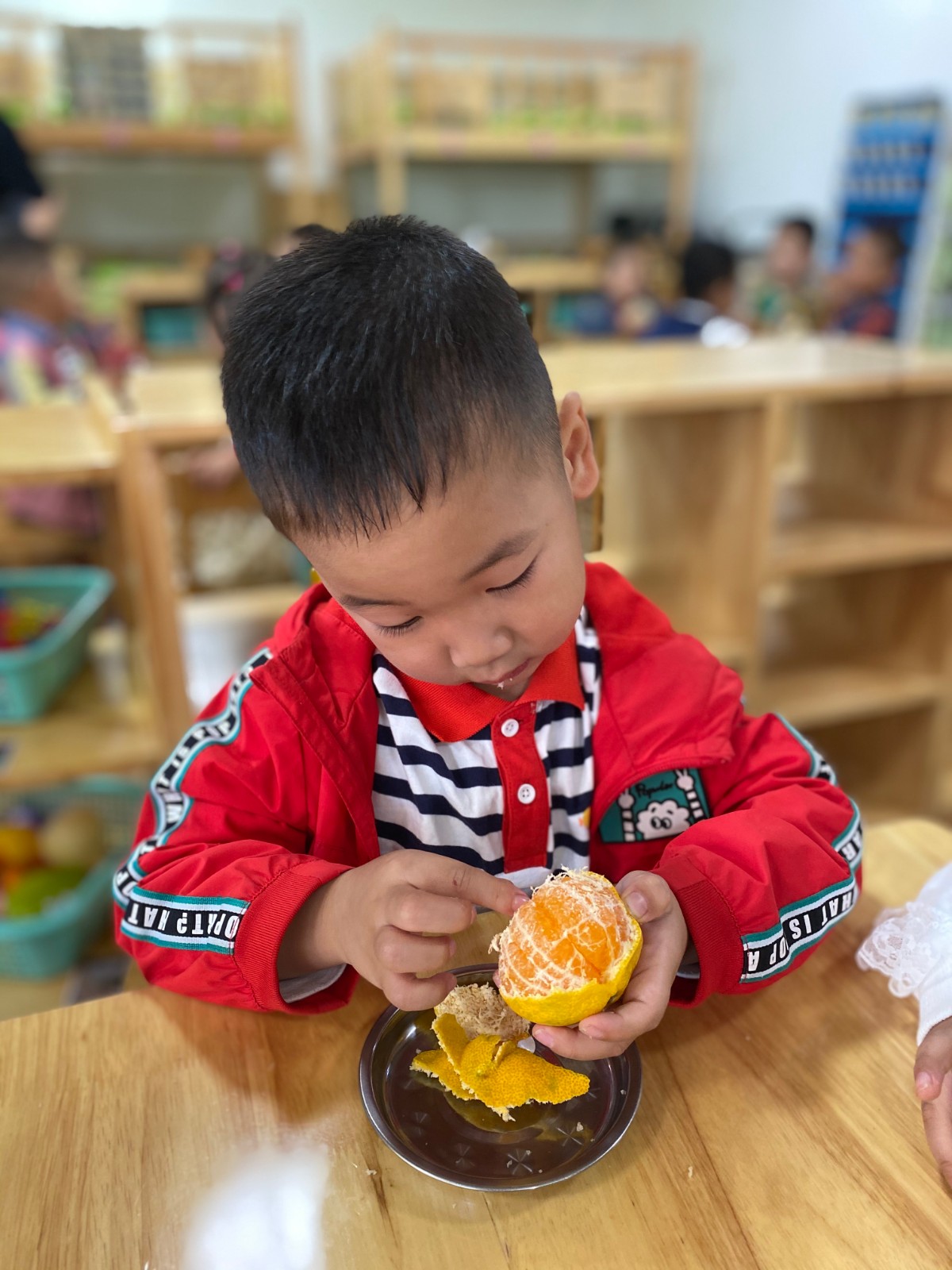 秋天到了,孩子们今天吃橘子啦!我们先观察了橘子的外表,圆圆的,是橙色的,然后我们仔细摸了摸橘子的外皮,凉凉的,有点褶皱的感觉。观察完了橘子的外表特征,我们要品尝品尝啦!怎么样才能吃到橘子呢?首先找到橘子的底部一个凹进去的地方,用一个手指把橘子皮戳一个洞,然后就可以剥开橘子皮啦!自己动手剥开的橘子真甜真好吃!