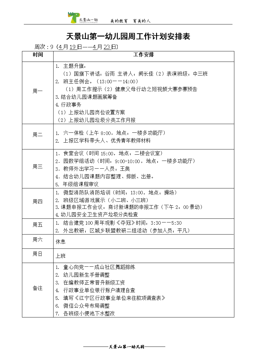 下一篇天景山第一幼儿园20-21下第十周工作计划安排表